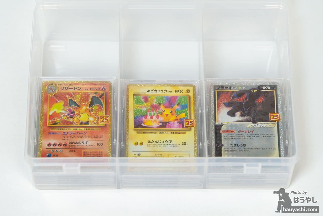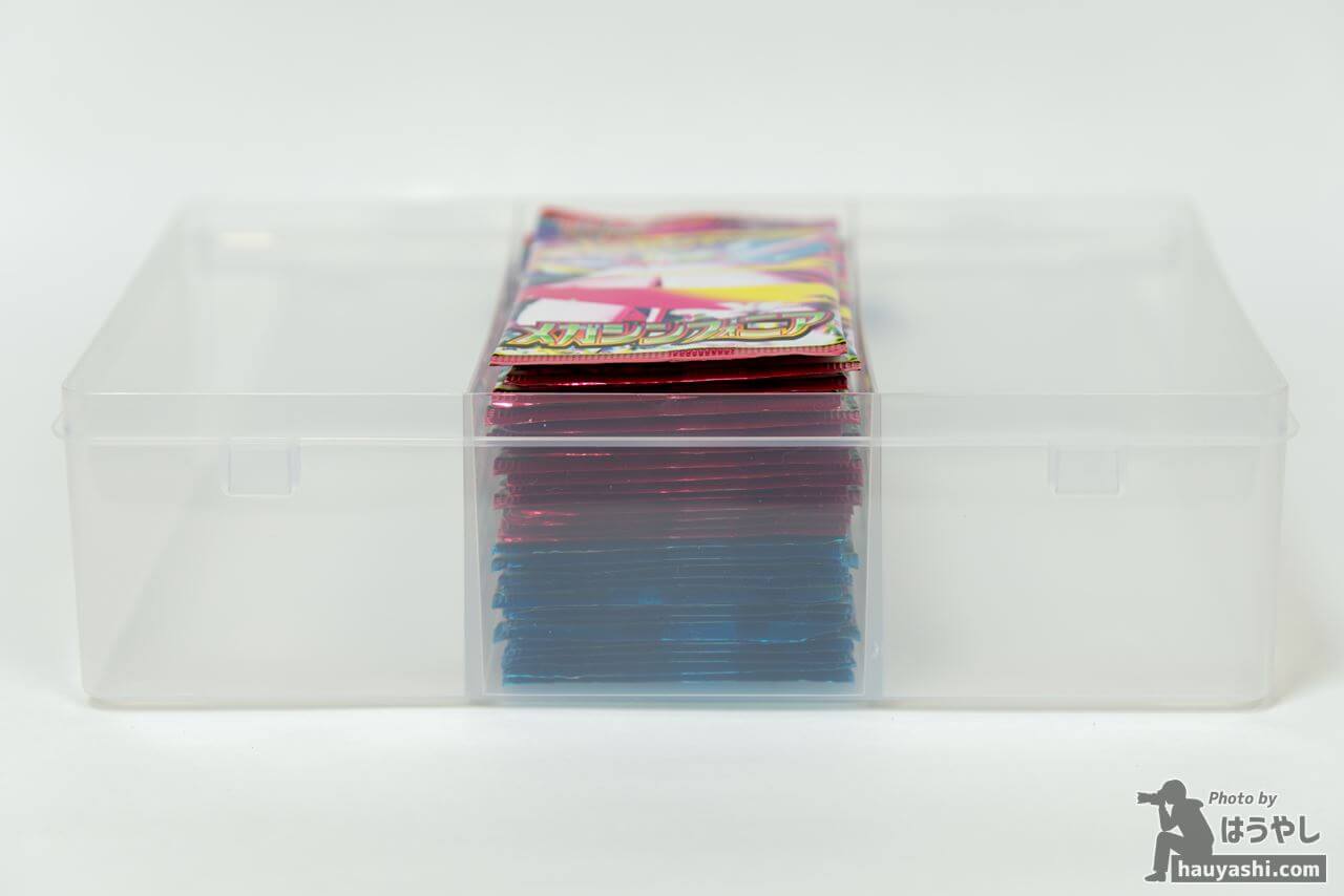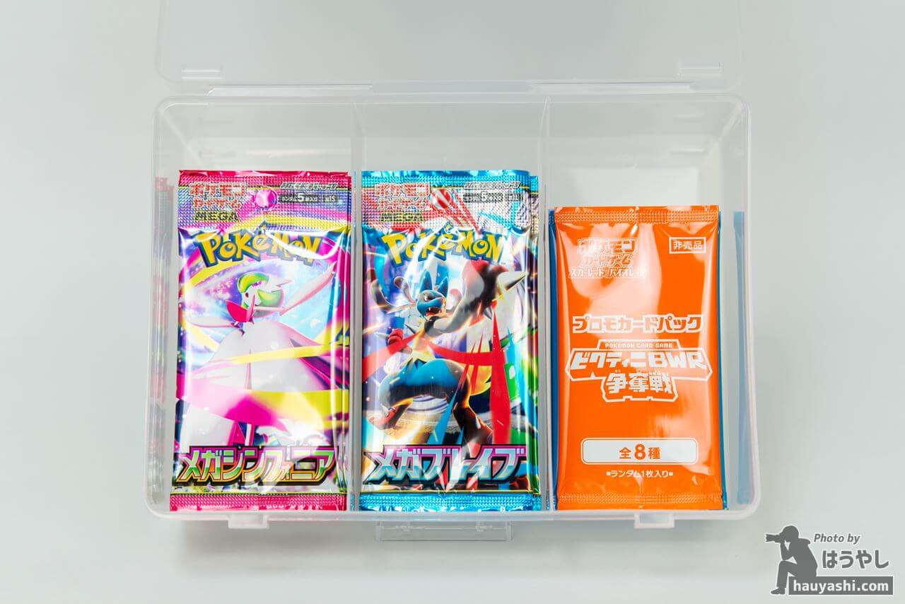 それでは実際にポケカを例に挙げて、店舗で購入できる拡張パックと、非売品のプロモカードパック、2種類のサイズを収納してみました。