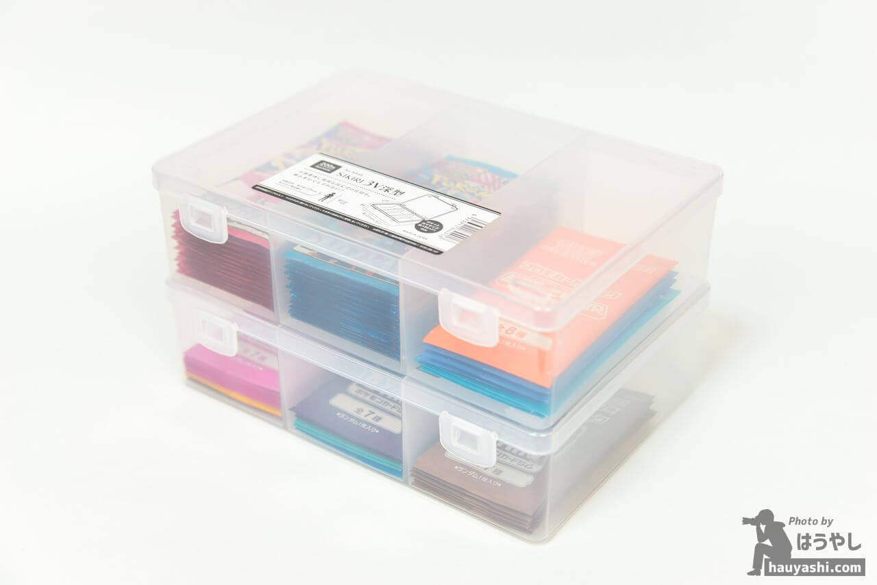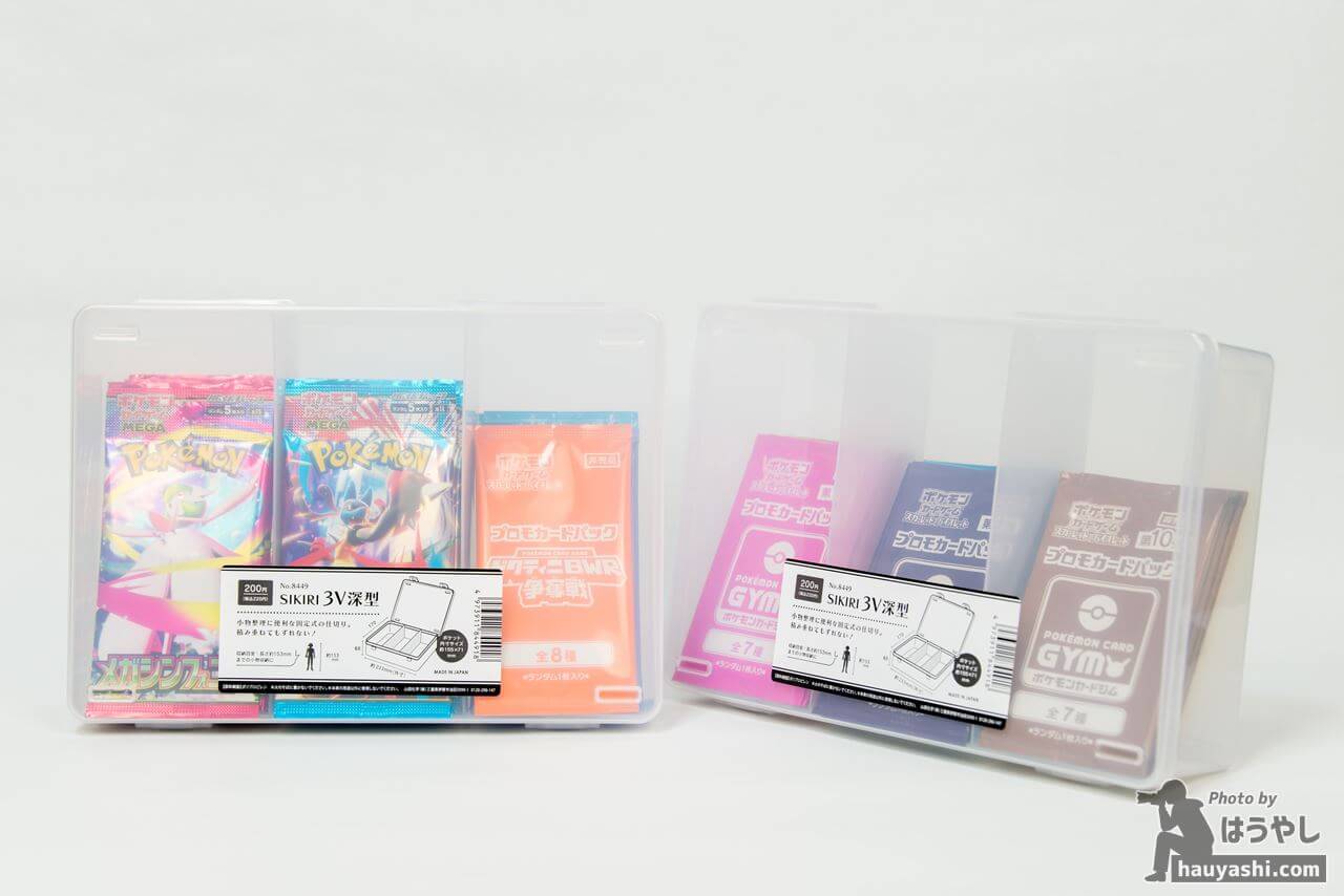 未開封パックを保護するグッズに入れた状態で、SIKIRI 3V 深型に収納することはできませんでした。また、カード単体を保護するグッズも収納できないものが多いです。